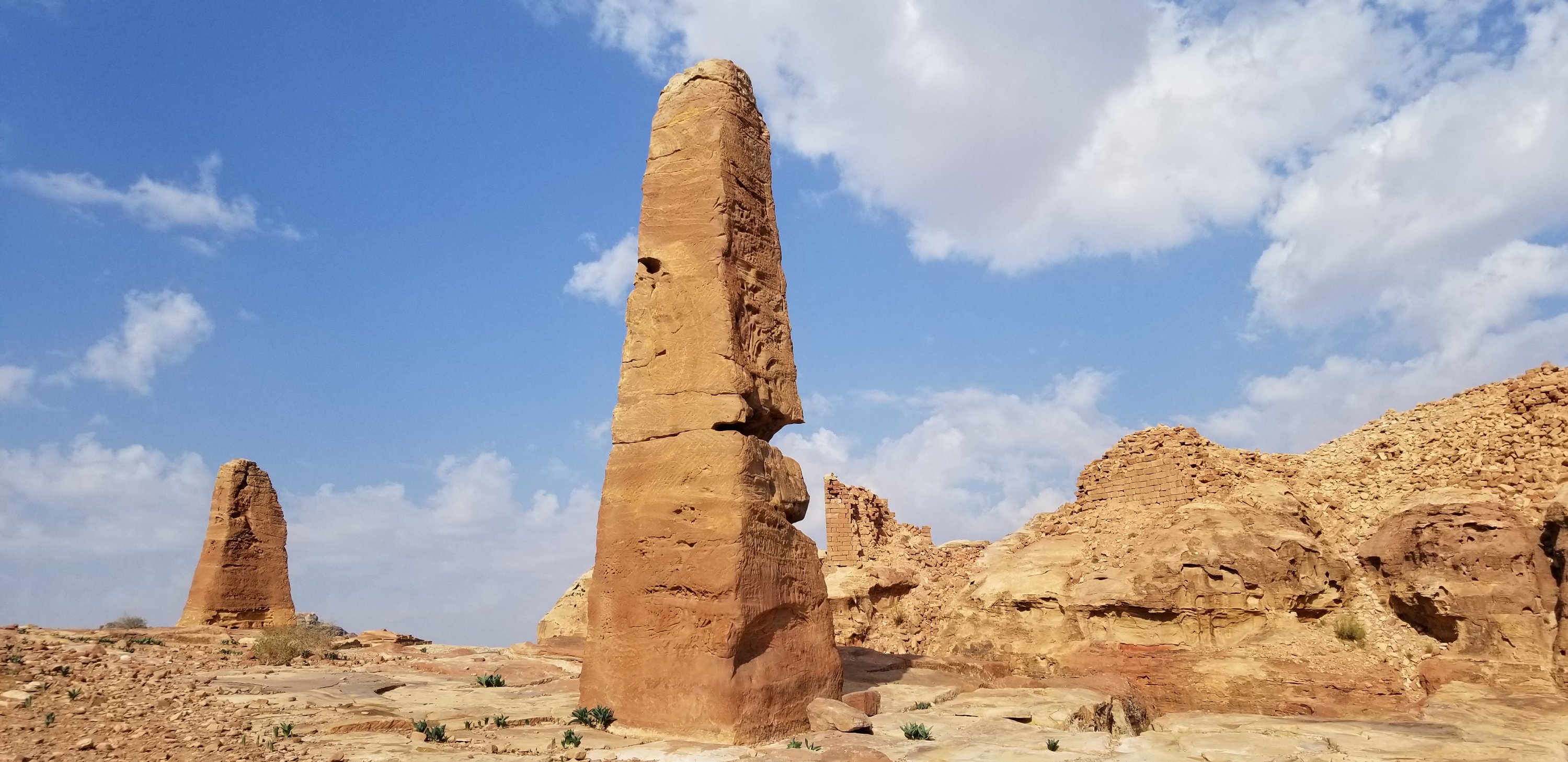 N earby were two obelisks, believed to represent the chief male and female Nabatean deities. They were created by leveling the hill top, leaving only the material that makes up the obelisks.