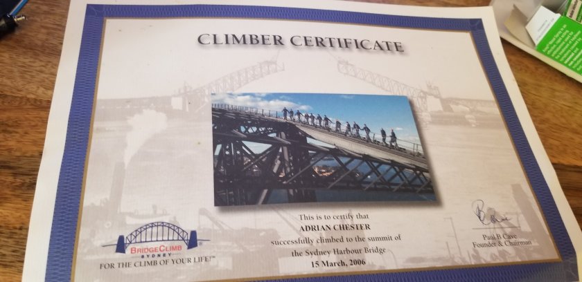 A certificate for my climb of the Sydney Harbor Bridge.