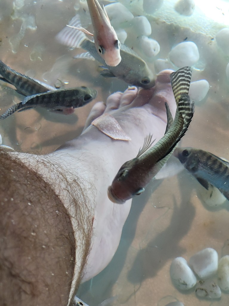 The next time I braved Pub Street was a Friday night, and a little later in the evening. More tourists, and small handfuls of well-heeled Kymers, but not exactly pumping. I enjoyed a few draft beers, and then a delicious mango daiquiri at Arum’s suggestion, the effects of which I didn’t feel until I stood up and almost fell over. I decided this was a good time to try a fish massage. The idea is that you put your long-suffering tourist feet into the fish tank, and the carp (Garra rufa) eat the dead skin from your feet, leaving them as smooth as a baby’s bottom. It costs three USD, and you get either free water or a beer. Of course, I asked for the beer, the last thing I needed at this juncture was to sober up. I gingerly put my feet in the water, and the fish started to take an interest in my uncared-for feet. Some of them fought over prime real estate on my left foot, which was a little strange to see. It felt very odd, sometimes pleasant, often way too ticklish to be comfortable even in my altered state, and sometimes painful with one of the more vigorous and larger fish.