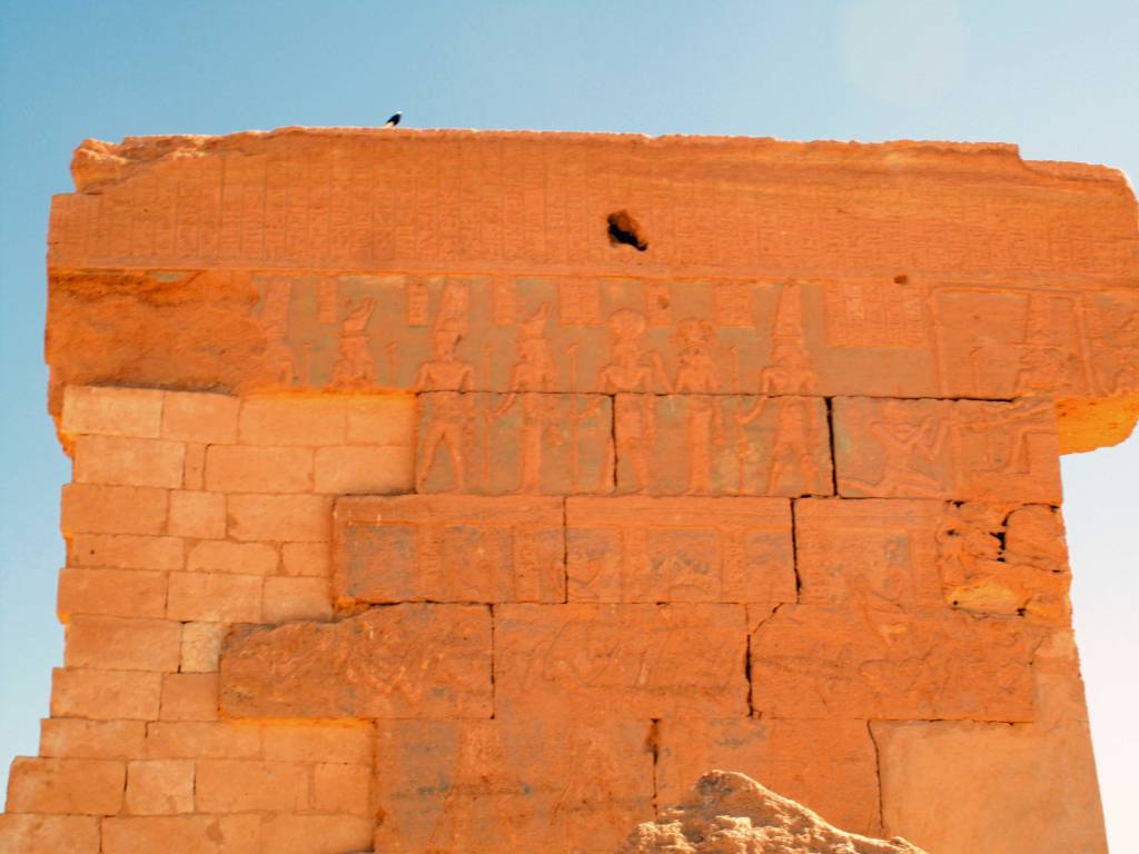 Built for the worship of Amun around 340BCE, it’s now one restored wall and a lot of rubble. It was also blessedly free of other humans. On closer examination, the restored wall features carvings typical of Ancient Egypt.