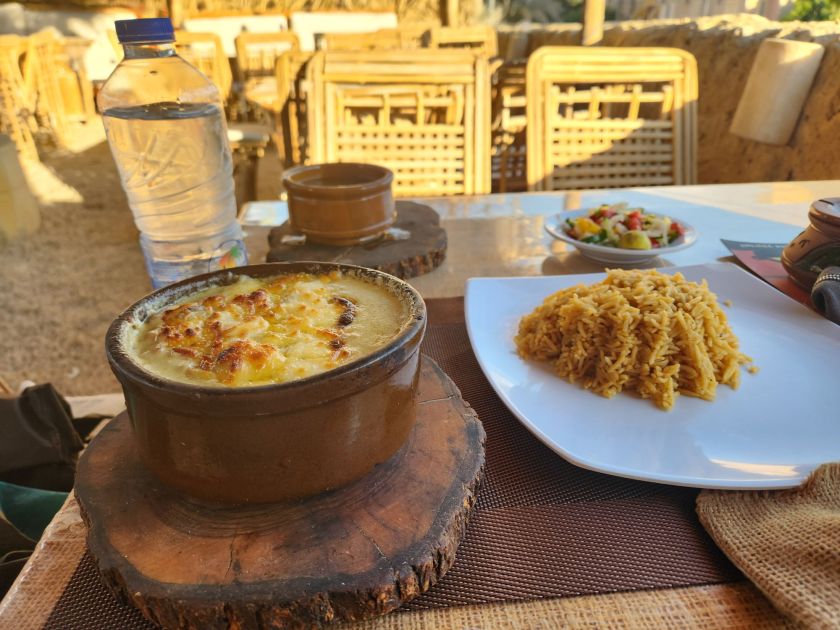 I ordered Tagine el Amir, a vegetable stew topped with cheese, and it came with rice, lentil soup, and a small salad, and was delicious.