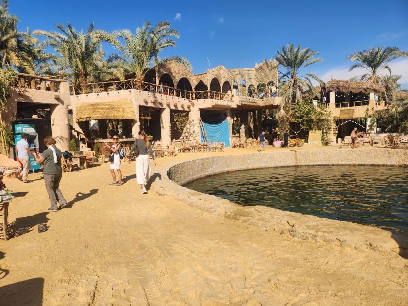 The next morning, after a coffee that was supposedly the best in Siwa, I flagged down a Tuk-tuk and, after a long and complicated negotiation, I headed to Cleopatra’s Pool. A hot spring feeds a man-made circular pool, with a constant temperature of 29°C. It’s definitely a tourist trap, surrounded by cafes and souvenir shops, and it cost me 100 EGP before I even got my toes wet.