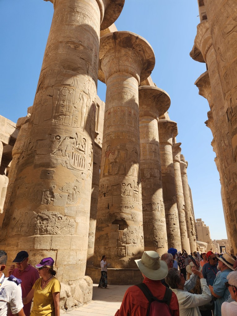 Continuing on through the complex is the Great Hypostyle Hall. Covering over five thousand square metres, a hundred and thirty-four columns supported a long-gone roof. Much like the Luxor Temple, the psychological effects in an era where most people lived in hovels would have been phenomenal: How can Pharaoh not be a god when he can build such a thing? Each column was deeply carved, increasing the effect.